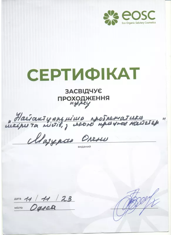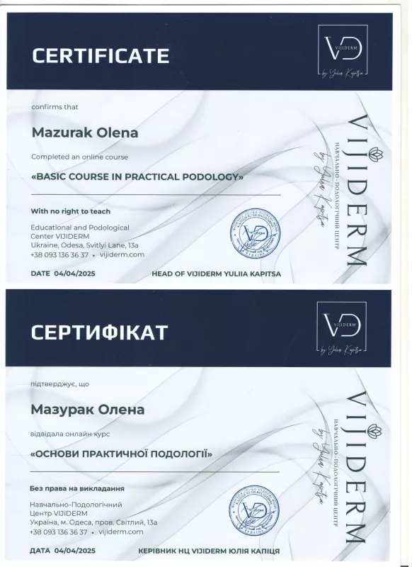 Професійний подолог, майстер манікюру та педикюру з 2020 року у місті Біляївка Одеської обл. Допомагаю клієнтам вирішувати проблеми нігтів і стоп без болю та дискомфорту. Індивідуальний підхід, стерильність, акуратна робота та турбота про результат. Працюю за попереднім записом. Консультую та підбираю догляд саме під ваші потреби."